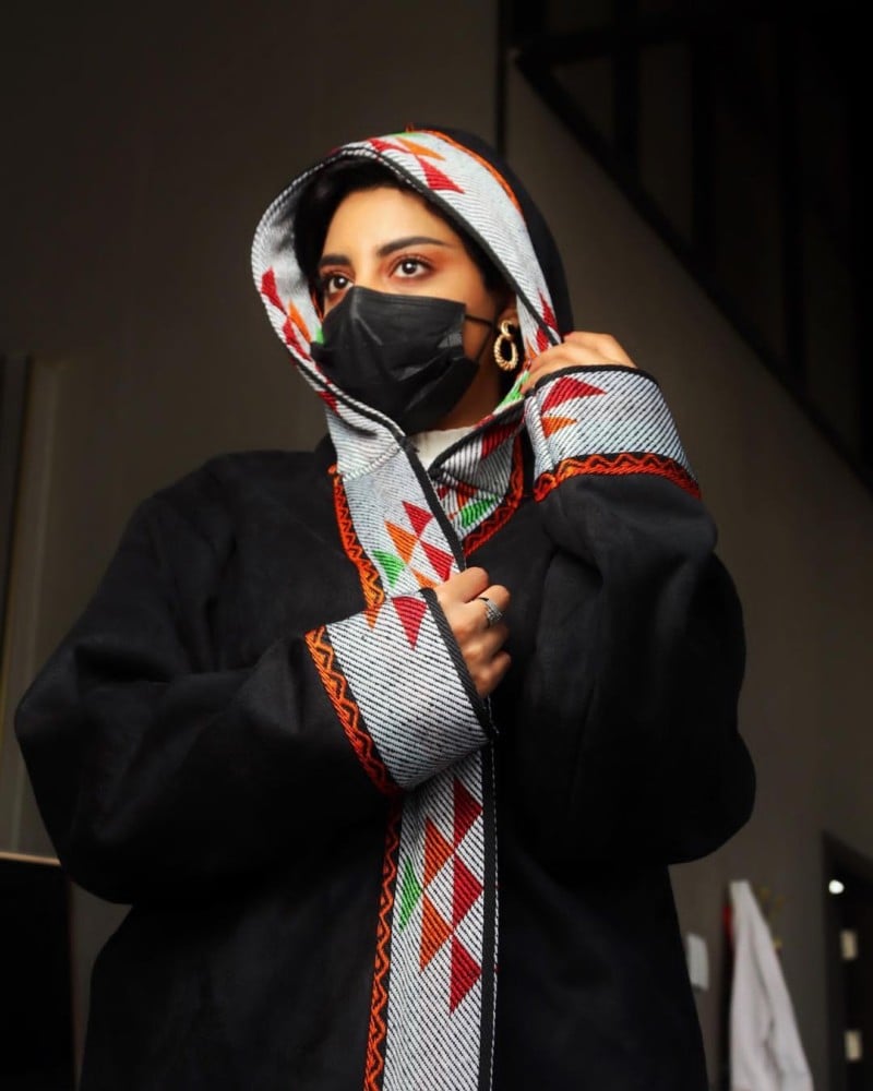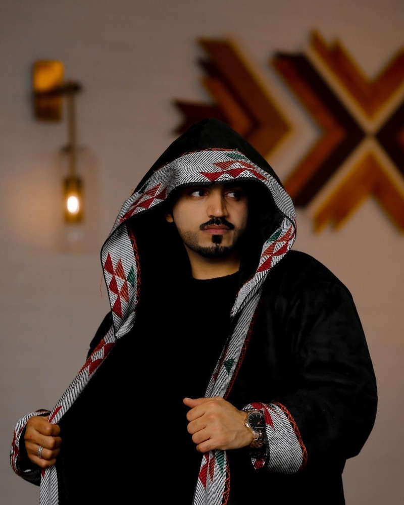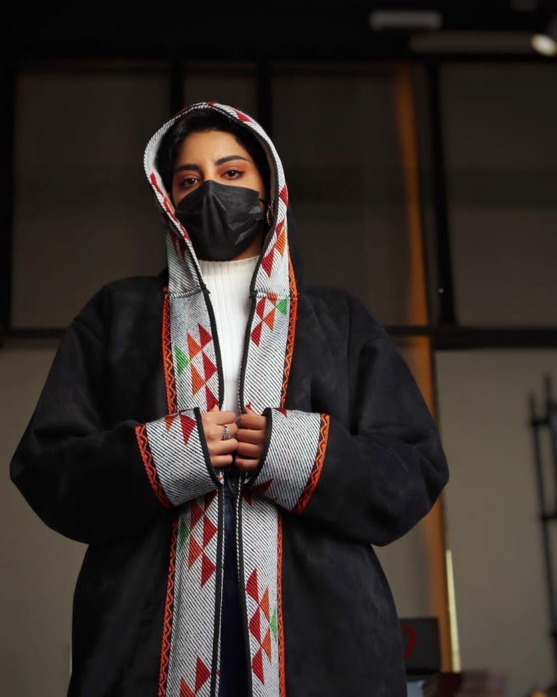 قطعة شتوية لا غنى عنها من سارة فروة مخمل من داخلها وتتميز بقماش الشامواه باللون الأسود الرصاصي من الخارج مع أفخم نقشة سدو البدوية وأيضا قبعة الرأس المنقوشة لدفء مضاعف وهي مصممة خصيصا لتكون مريحة على اللبس