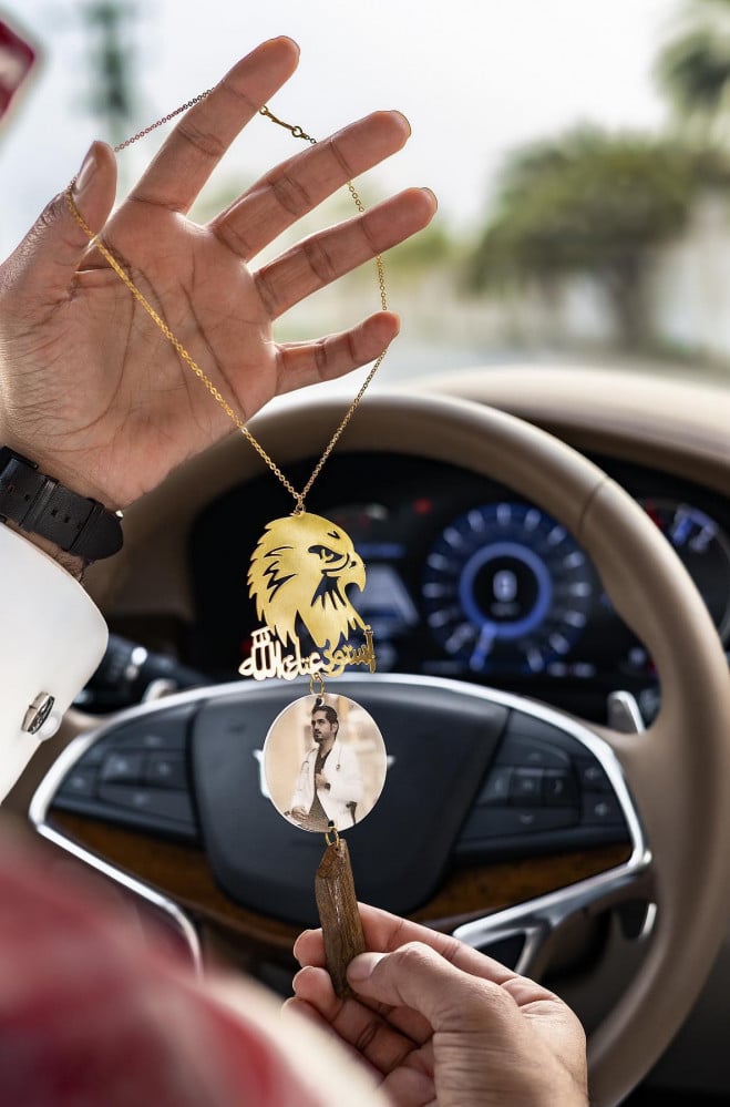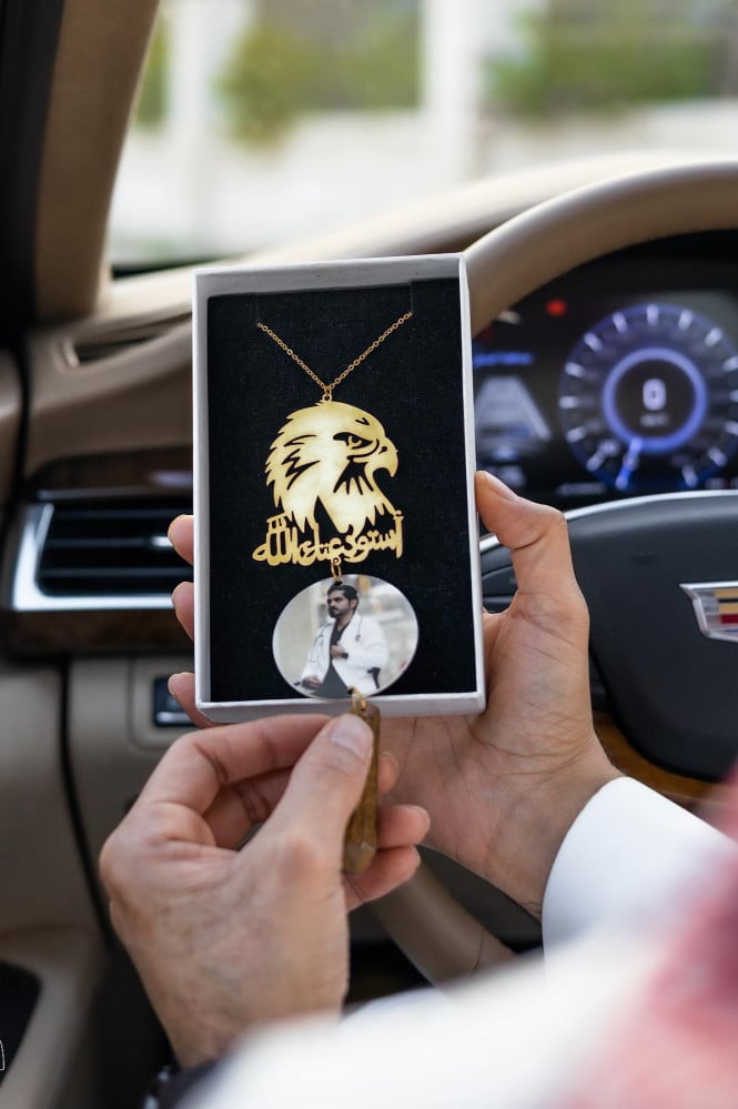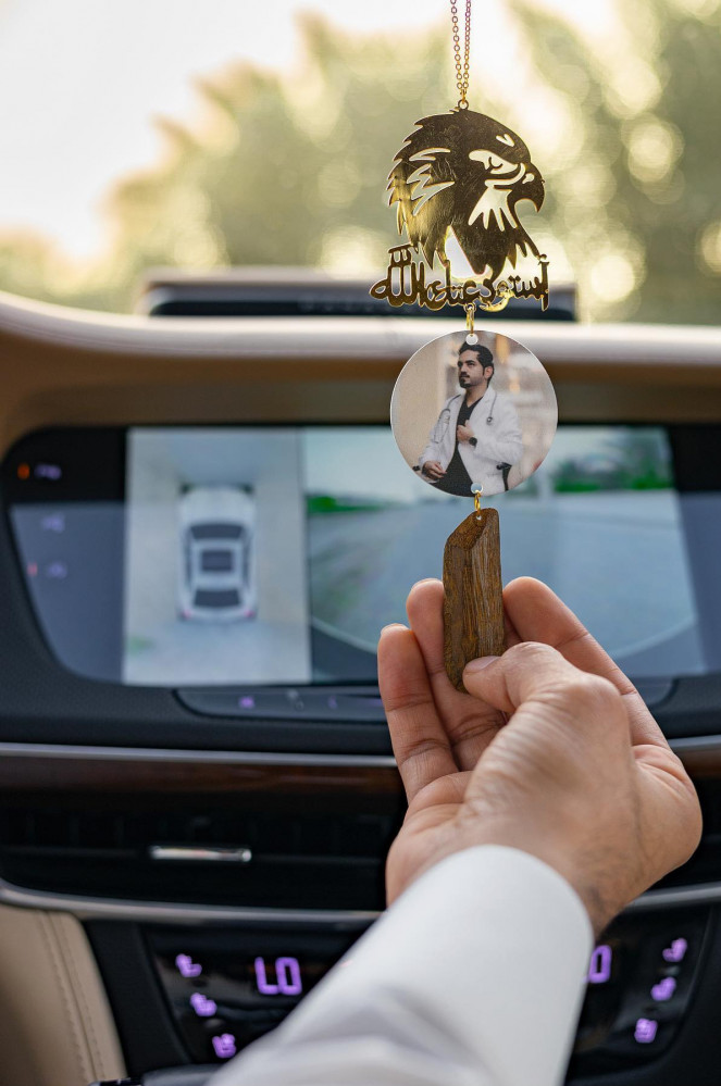 تعليقة سيارة عود موروكي مع رسمة صقر وعبارة استودعتك الله بفن واحترافية بطلاء ذهبي أو فضي مع علبة أو كيس من سارة.