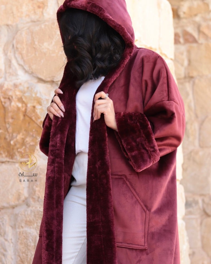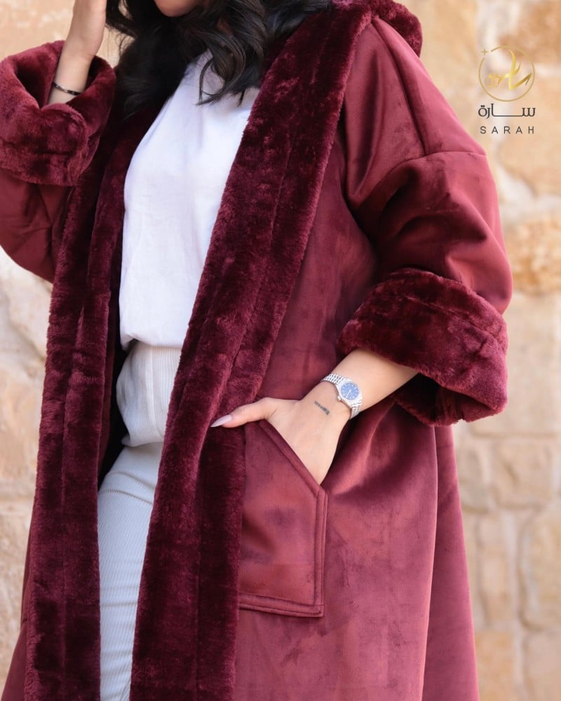 حافظ على أناقتك وفخامتك في فصل الشتاء مع أرقى فروة شتويه من الداخل فرو باللون العنابي بنقشة السدو البدوية المتألقة مع قبعة الرأس المنقوشة لدفء مضاعف وبتصميم مريح وعملي وفاخر