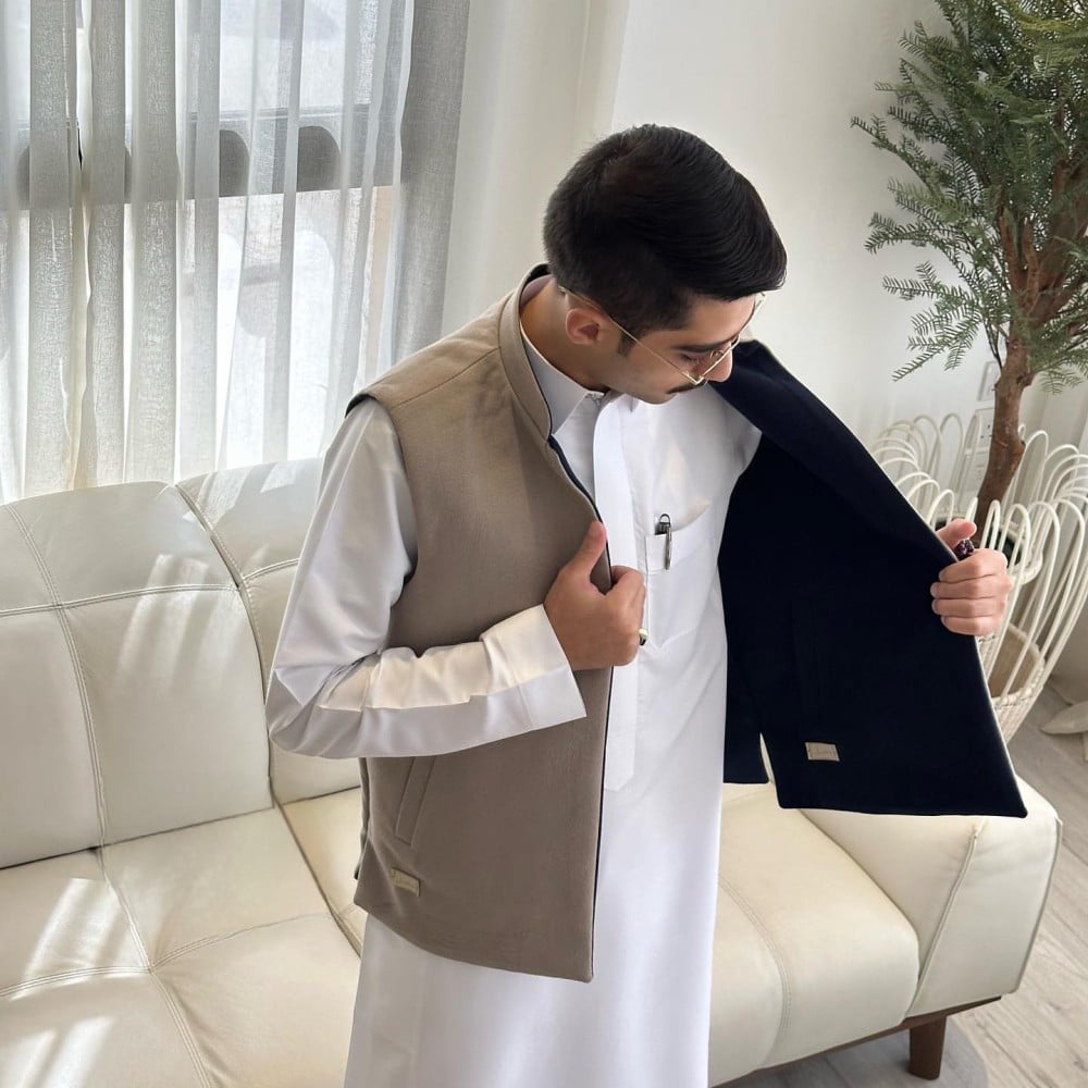 أفخم طلة رجالية وقطعة مميزة من ملابس شتوية فاخرة مع سديري رجالي جوخ فاخر بصناعة يدوية جودة عالية وبتصميم مميز وأنيق مع إمكانية لبسه على الجهتين حيث تستفيد منه بلونين مختلفين مع جيوب جانبية كما موضح فالصورة وهو لجميع الاعمار والمناسبات